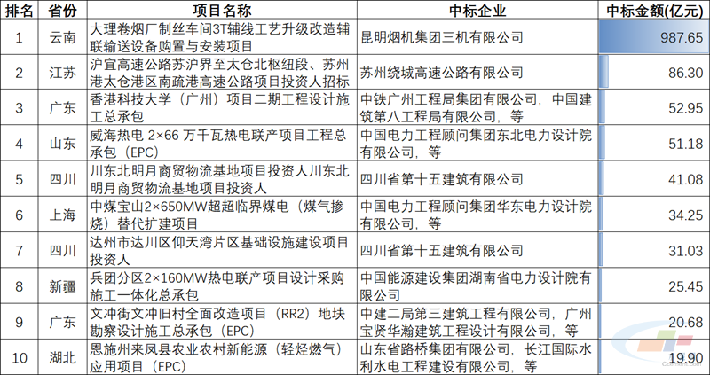 从中标项目金额排名看,云南的大理卷烟厂制丝车间3T辅线工艺升级改造辅联输送设备购置与安装项目以987.65亿元位居第一,江苏的沪宜高速公路苏沪界至太仓北枢纽段、苏州港太仓港区南疏港高速公路项目投资人招标以86.3亿元位居第二,广东的香港科技大学(广州)项目二期工程设计施工总承包以52.95亿元位居第三。