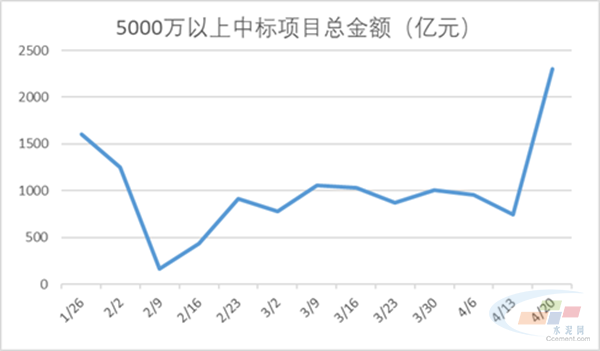 据中国水泥网水泥大数据研究院不完全统计,2025年4月14日~2025年4月20日全国重大建筑工程项目(中标金额>5000万)中标数量共504个,较前一期增加187个,中标总金额为2302.07亿元。
